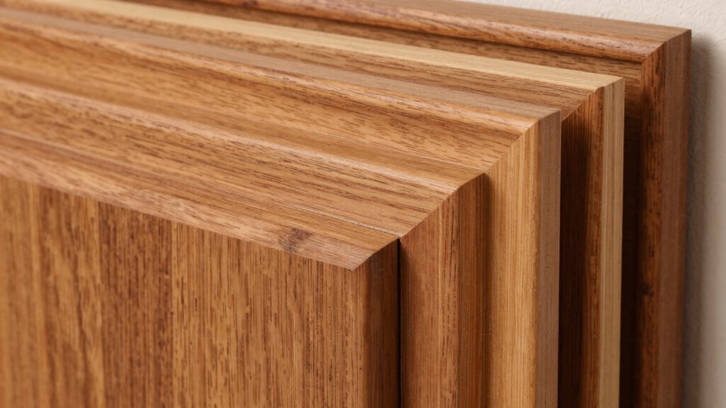 Aren’t you looking for wood that resists warping over time? Hardwoods like quartersawn oak, cherry, and maple are your best bets because they offer excellent grain stability and consistent movement. These species are less prone to expansion and contraction, making them ideal for frame-and-panel designs. When you emphasize species selection, you guarantee your project remains durable and beautiful, even as environmental conditions change.