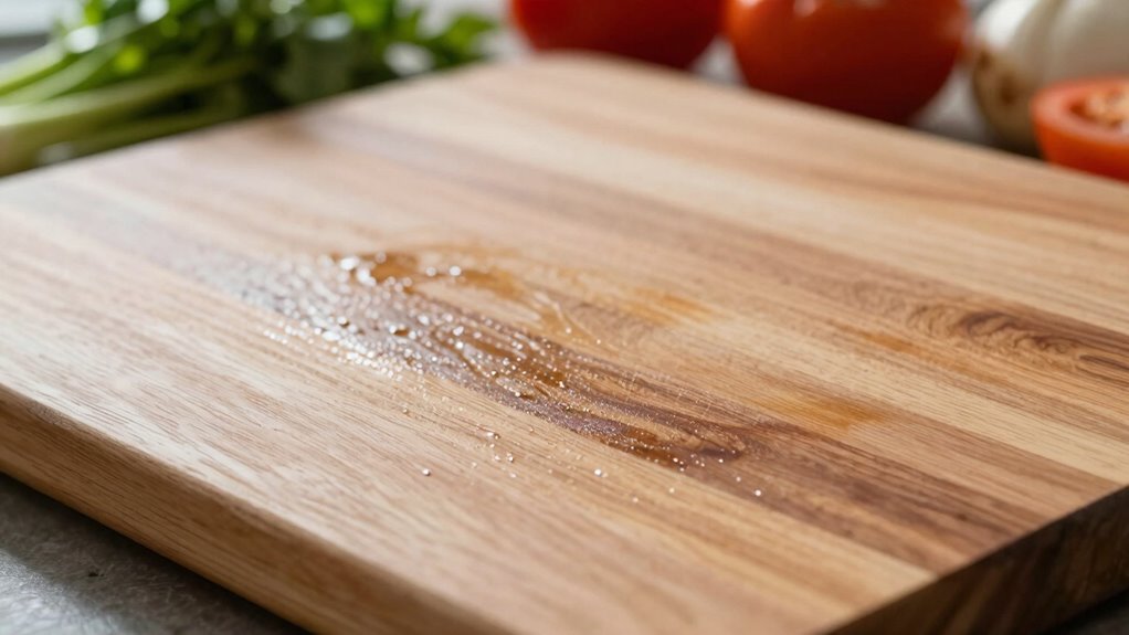 Imagine you’re in a zero-day situation—your finish shows signs it’s no longer safe. You’ll notice surface discoloration, which hints at deterioration, and possibly a toxic chemical presence if it’s breaking down. These signs mean the finish isn’t food-safe anymore. When you see these changes, it’s time to strip and reapply a safe finish. Don’t risk contaminants leaching into your food; stay vigilant with your finishes.