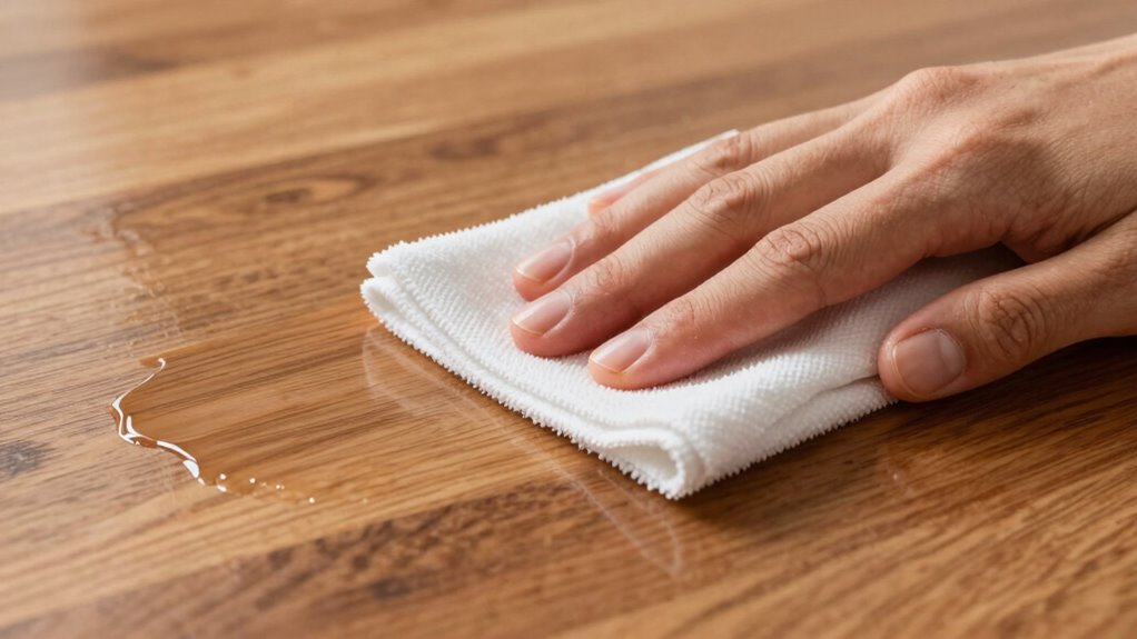 Oh, the irony—dust and debris landing right after your perfect finish. To fix it, gently remove dust or debris by lightly sweeping with a tack cloth or a soft brush. Avoid wiping or pressing down, which can smudge the finish. Dust removal and debris cleanup require patience and a delicate touch. Once cleared, lightly sand the area if needed, then carefully reapply your wipe-on poly to restore that flawless look.