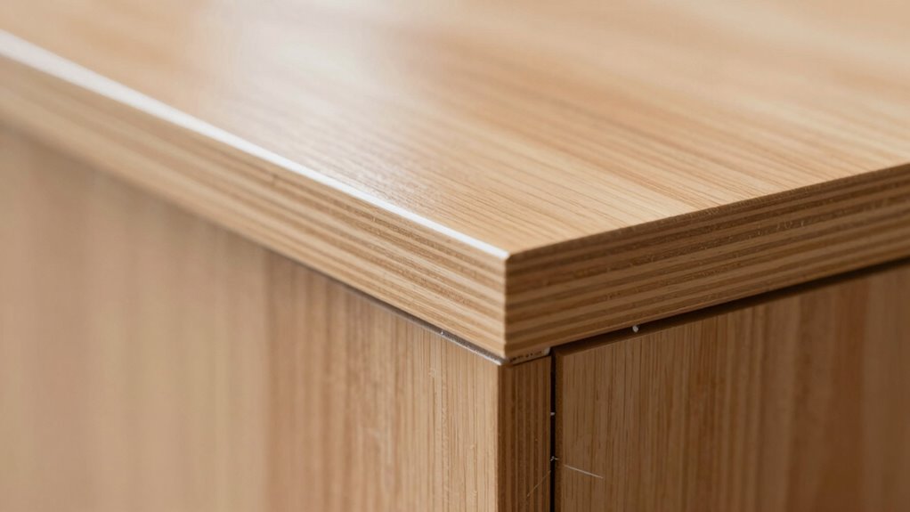 The Trim-Flush method effectively prevents tear-out during edge banding by guaranteeing the edge is perfectly aligned and smooth before trimming. Proper alignment respects the grain direction, reducing stress on the material and preventing splintering. Maintaining cut consistency along the edge helps create a clean, even surface, minimizing the risk of tear-out. When you follow this method, you get a seamless finish that looks professional and lasts longer. Ensuring high-quality materials are used can further improve the durability and appearance of the finished edge.