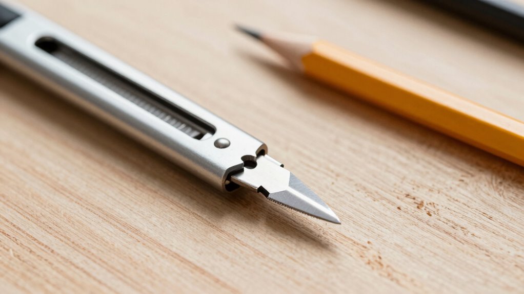 Even the most carefully maintained marking knives can encounter issues that affect their performance. Common problems include inconsistent marking lines, dull blades, or reduced blade durability. These issues can compromise your accuracy and workflow. To troubleshoot, start by checking the blade’s sharpness; a dull blade hampers marking consistency. Ensure the blade is clean and free of debris, which can dull it quickly. If the blade wears out prematurely, consider replacing it with a higher-quality or more durable option. Additionally, verify that the blade is properly aligned, as misalignment affects marking accuracy. Regular maintenance, such as cleaning and sharpening, can extend blade durability and keep your marks precise. Using quality material, which can enhance the longevity and performance of your marking tools, is also beneficial. Proper storage methods can prevent rust and damage, ensuring consistent results. Incorporating proper technique into your workflow can further improve your precision and craftsmanship. Addressing these common problems guarantees consistent results and improves your overall craftsmanship.