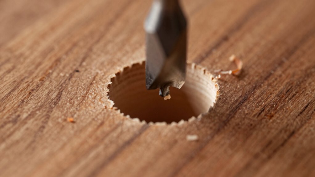 To prevent tearout when using Forstner bits, applying proper techniques can make a significant difference. Start by paying attention to the grain direction; always drill with the grain rather than against it to reduce splintering. Using a slow drill speed helps keep the bit under control and minimizes tearout, especially on delicate or hardwood surfaces. Applying light, steady pressure prevents the bit from grabbing or chipping the wood. You can also place painter’s tape over the area before drilling to give the bit extra support and reduce splintering. Additionally, drilling from the backside first can help create a clean exit point. Incorporating proper training in drill techniques and safety can further improve your results and ensure cleaner holes with minimal tearout, giving your project a professional finish. Being aware of wood grain orientation is essential for achieving the best outcome, as understanding wood properties can help you select the right approach for different materials. Moreover, selecting the appropriate bit sharpness and maintaining it regularly ensures cleaner cuts and reduces tearout. Paying attention to drill bit maintenance can also contribute to achieving smoother results and prolong the life of your tools.