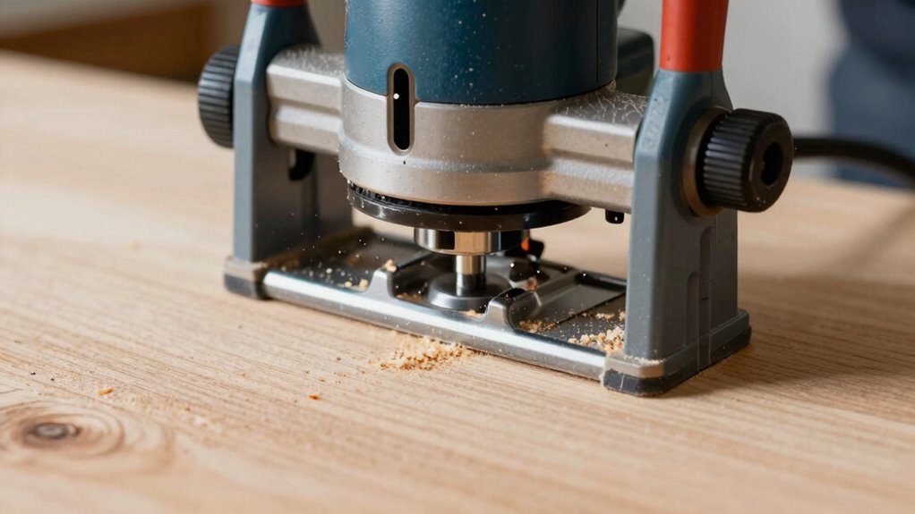 Incorrect feed direction can greatly impact the quality of your cuts, often leading to burnt wood and grabby surfaces. Using the wrong bit selection or not adjusting router speed for your bit can cause issues. For example, a dull or inappropriate bit can increase friction, resulting in burning and rough cuts. Always choose the right bit for your project and material, ensuring it’s sharp and suitable. Additionally, router speed plays a critical role; running your router too fast or too slow can lead to improper cuts and burn marks. Match your router speed to the bit’s specifications and your material. Ignoring these factors means you’ll struggle with clean cuts, risking damage to your workpiece and your router. Proper bit selection and speed adjustment are essential for smooth, safe, and accurate routing.