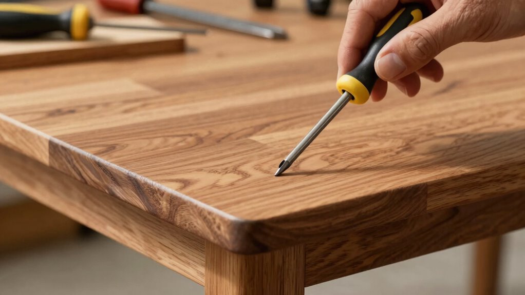 Before concluding your efforts, double-check that you’ve addressed all common causes of wobbliness. First, make precise table leg adjustments by tightening or leveling any uneven legs. Next, inspect the surface for scratches or rough spots; applying surface polishing can restore stability and smoothness. Ultimately, verify that all bolts and screws are secure, tightening any loose joints. If the table still wobbles, re-examine the legs and surface carefully. Consistent surface polishing not only improves appearance but also helps identify hidden issues. Properly aligning the legs and ensuring a smooth, even surface will give you a sturdy, wobble-free table. Following this final checklist guarantees a lasting fix and saves you from future wobbling frustrations.
