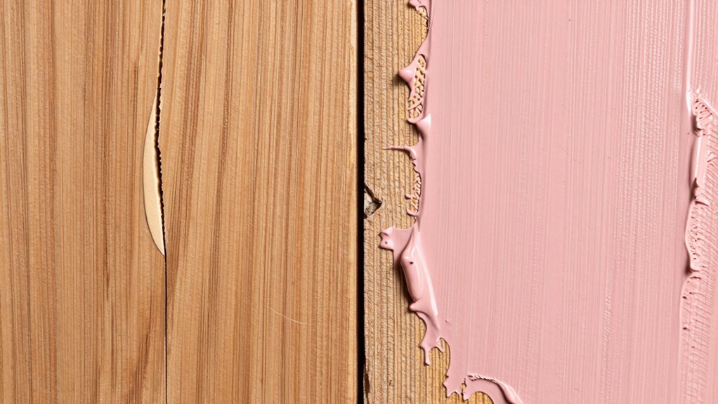 The composition of wood filler and putty considerably influences their flexibility and how they perform in repairs. Wood filler typically contains wood particles or powders mixed with a binder, which creates a sturdy yet somewhat flexible material. This composition differences allows it to expand or contract with wood, offering better flexibility variation. Putty, on the other hand, is usually made from a combination of oils, resins, and pigments, making it more rigid once dry. Its lower flexibility means it’s less forgiving to wood movement. If you need a product that can handle slight expansion and contraction without cracking, wood filler is your best choice. Conversely, putty’s rigidity makes it suitable for detailed or small repairs where flexibility isn’t a priority.