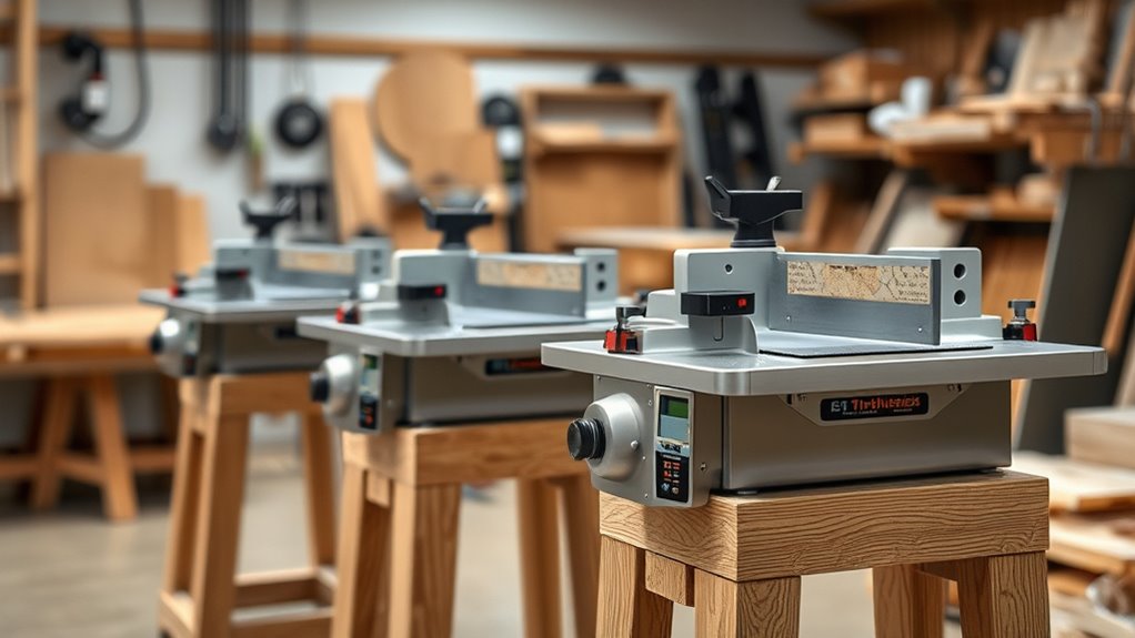 Safety features are vital in a 13-inch thickness planer because they protect me from injuries and guarantee smooth operation. I look for emergency stop switches, blade guards, and automatic shut-off systems that activate when something’s wrong. Dust collection ports are also necessary to keep the workspace clean and prevent inhaling harmful particles. These features give me confidence to work efficiently while staying safe.