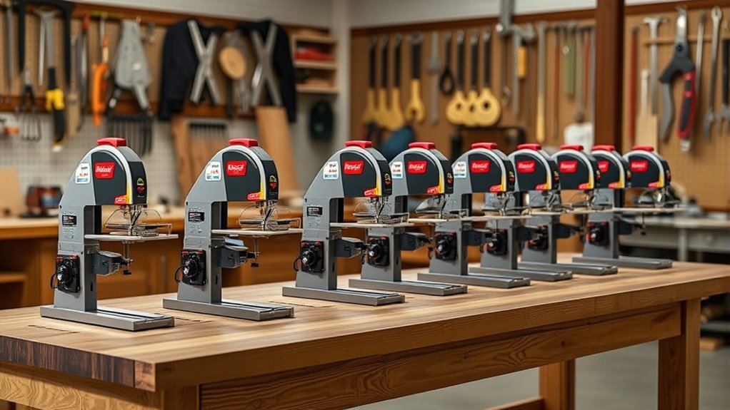 Build quality and durability play a pivotal role in ensuring your bandsaw performs reliably over time. A sturdy cast iron frame helps resist vibrations, providing stability during cuts and reducing wear on components. High-quality blade guides and tensioning mechanisms made from hardened materials keep blades aligned, ensuring precise cuts and longer blade life. Corrosion-resistant coatings, like powder-coated or anodized surfaces, protect the machine from rust and environmental damage, extending its lifespan. The robustness of trunnions and adjustment components guarantees accurate table positioning and consistent angle adjustments, even after heavy use. Additionally, reliable welds and high-grade steel parts contribute to overall durability, making the bandsaw resistant to mechanical stress and wear. Investing in a well-built machine means fewer repairs and more dependable performance over the years.