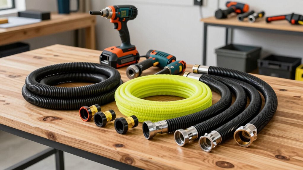 Since longer hoses can give you more freedom to position your dust collector away from your work area, it’s important to contemplate the right length for your setup. A hose that’s too short may restrict movement and force you to reposition equipment frequently, while an excessively long hose can be cumbersome and prone to tangling. Typically, hoses ranging from 10 to 20 feet strike a good balance, offering flexibility without sacrificing manageability. A highly flexible hose made from reinforced PVC or rubber makes maneuvering around obstacles easier and reduces kinking. This flexibility helps maintain consistent airflow and prevents damage during installation and use, which can extend the life of your system. Ultimately, selecting a hose with the right length and flexibility ensures seamless connection and efficient dust collection across your entire workspace.