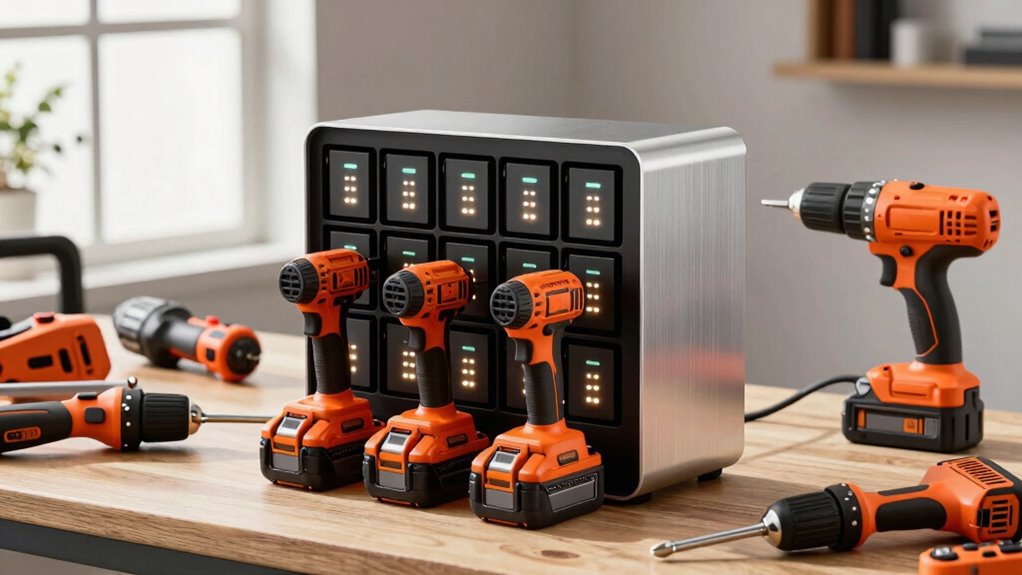 If you’re looking for the 15 best battery charger stations for cordless tools in 2026, I’ve found options that boost organization and efficiency. These include large power tool organizers, fast multi-port chargers like DEWALT and Milwaukee models, and versatile wall mounts for easy access. Many feature USB charging, quick 15-minute setups, and safety protections. Keep watching to discover detailed reviews and tips to help you choose the perfect setup for your workspace.