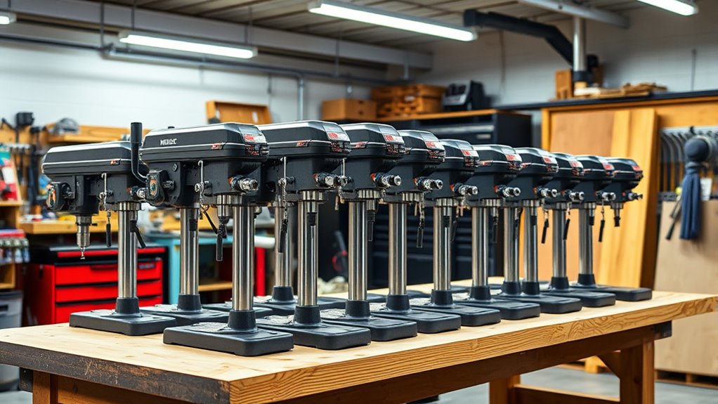 In 2026, noise levels among top benchtop drill presses vary, but I’ve found that models with quieter motors, like the WEN 4214, produce less noise, making your workspace more comfortable. Cheaper models tend to be louder, which can be distracting. If noise matters to you, I recommend checking decibel ratings and opting for models designed with noise reduction features. This way, you can work efficiently without disturbing your environment.