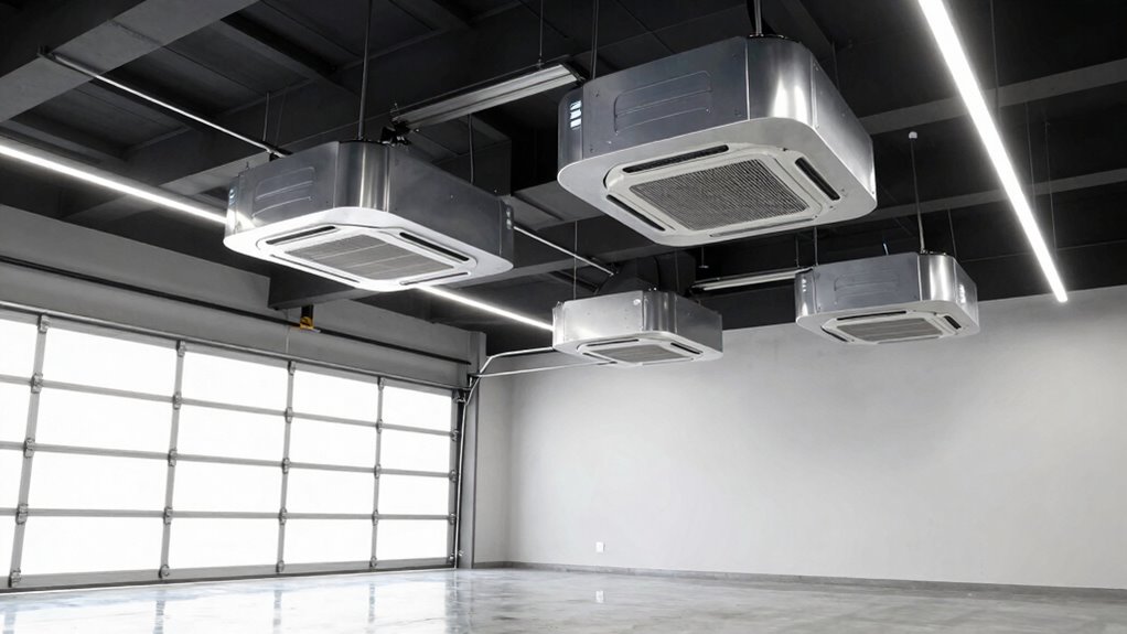 Selecting the right filtration technology for your ceiling-mounted unit depends on the specific pollutants and dust levels in your workshop. HEPA filters, like H11 or HEPA 13, are excellent for capturing at least 99.97% of particles as small as 0.3 microns, making them ideal for fine dust and allergens. MERV-rated filters, such as MERV 11, effectively trap particles between 1 and 10 micrometers, with higher ratings providing increased efficiency. Activated carbon filters are vital for removing odors and gaseous pollutants, complementing particulate filters. Electrostatic precipitators use charged plates to attract dust, offering low-maintenance options with variable efficiency. Two-stage systems combine pre-filters with fine filters, extending filter life and boosting overall air cleaning performance in workshop environments.