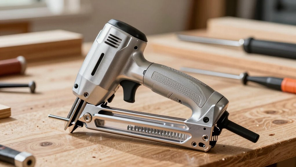 Firing mode options play a crucial role in how a cordless finish nailer performs across different tasks. Most models offer two main modes: single (sequential) and contact (bump) firing. Single firing provides precise control, making it perfect for detailed work where accuracy matters. You can carefully position each nail, reducing the risk of mistakes. Contact firing, on the other hand, allows for rapid nailing—just press the nose against the surface, and it fires immediately. This boosts productivity, especially for larger projects. However, contact mode tends to drain the battery faster since it fires more quickly. Many nailers let you switch easily between modes, giving you flexibility to handle both delicate and high-volume tasks efficiently. Choosing the right mode depends on your specific needs.