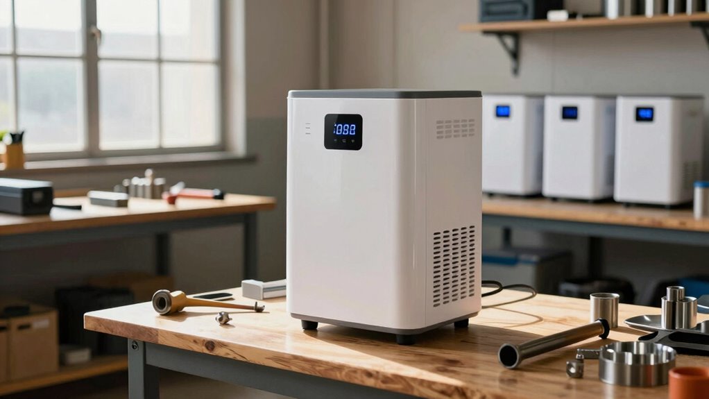 Have you ever worked in a workshop where loud noise disrupted your focus or nearby residents? Noise levels matter when choosing a dehumidifier for your small shop. Ideally, it should operate below 50 dB to prevent interference with work or causing disturbances. Ultra-quiet models produce around 28-30 dB, similar to a whisper or soft background music, which is ideal for concentration. If your workshop is close to living spaces or used for delicate tasks, selecting a dehumidifier with a dB rating under 40 ensures a quieter environment. Keep in mind, prolonged exposure to noise above 70 dB can cause discomfort and reduce productivity. Prioritizing low-noise operation helps maintain a calm, focused workspace without disturbing others nearby.