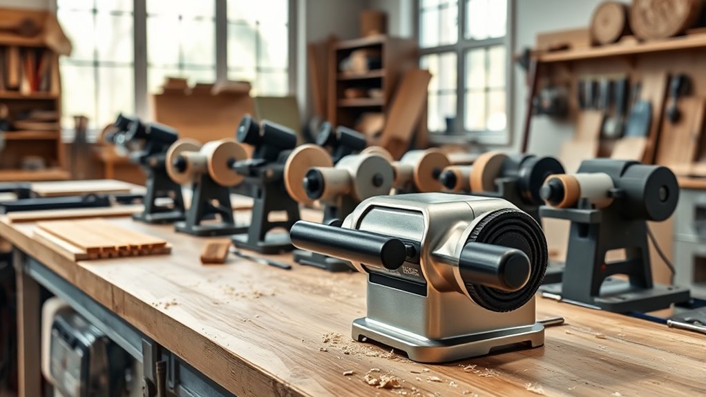 Choosing the right motor size is crucial because it directly impacts your drum sander’s performance and capacity. A motor’s horsepower (HP) determines how well the sander handles heavy-duty projects and thicker materials. Most models range from 1 HP to 3 HP, with larger motors offering more power for demanding tasks. Higher horsepower means faster sanding speeds and better performance, especially on dense or stubborn woods. However, more powerful motors also consume more energy, so balancing power with efficiency is key. Additionally, motor specifications like voltage and phase (single or three-phase) affect compatibility with your workshop’s electrical system. Selecting an appropriate motor size ensures your sander operates smoothly, avoids overloads, and lasts longer, making your woodworking projects more efficient and enjoyable.
