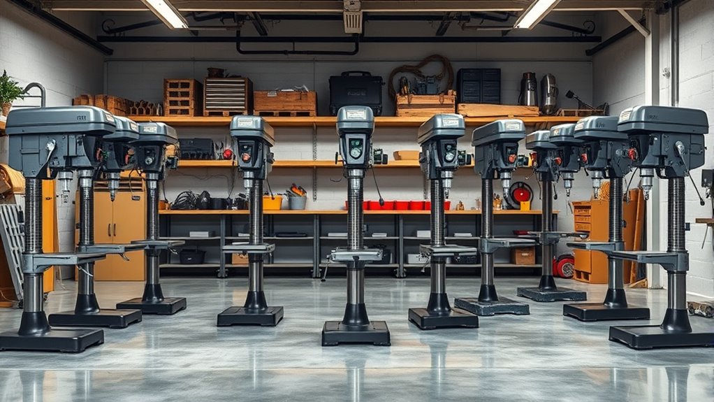 Looking for the best floor-standing drill presses for your garage workshop in 2026? I recommend considering models like the Garvee 13″ with variable speed, the WEN 4227T 12-speed, and the Jet 22-inch with 12 speeds. These units offer powerful motors, precise adjustments, and sturdy construction for any demanding task. Keep an eye on features like capacity, stability, and versatility—if you continue exploring, you’ll find the perfect fit for your needs.