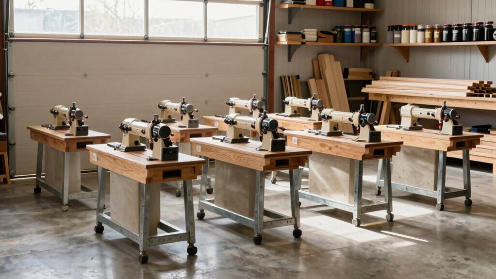 A full-size wood lathe built with high-quality materials guarantees it can handle the demands of a busy garage workshop. A sturdy, cast iron or steel bed minimizes vibrations, ensuring stability during precise cuts. Durability is reflected in precision-machined components, reinforced tailstocks, and a robust headstock designed for long-term use. Sealed bearings and heavy-duty motor mounts help prevent wear, maintaining consistent performance over time. Well-constructed lathes also feature adjustable, lockable controls and safety features that withstand frequent adjustments and rigorous work. Extended spindle and bed lengths, combined with high-quality locking mechanisms, boost structural integrity and lifespan. Choosing a lathe with these qualities guarantees it remains reliable, safe, and capable of handling your woodworking projects for years to come.