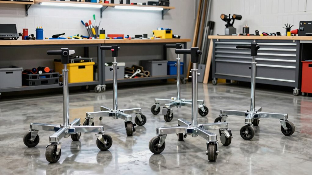 The durability of materials used in heavy-duty roller stands directly impacts their performance and longevity in a garage workshop. I look for stands made from high-strength or chrome-plated steel because they can handle demanding conditions without bending or breaking. Resistance to rust and corrosion is vital, especially in environments with moisture or outdoor exposure, so coatings or plating are essential features. Durable materials also ensure the stand supports maximum load capacities—ranging from 135 lbs to over 2,500 lbs—without deformation. Additionally, the quality of the roller’s surface, such as polished or zinc-plated steel, affects smooth movement and reduces material damage. Overall, investing in sturdy, corrosion-resistant materials guarantees safety, stability, and a longer lifespan for my workshop tools.