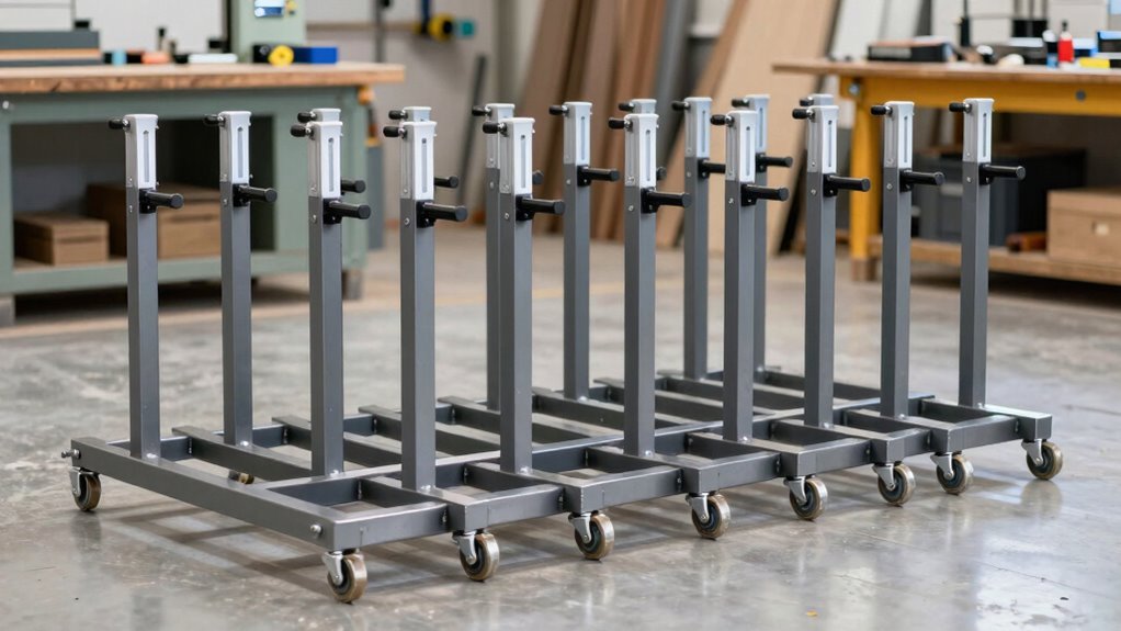 When evaluating heavy-duty roller stands, portability and storage are crucial factors that can make or break your workflow. I look for stands with foldable or collapsible designs that maximize portability and make transport simple. Lightweight materials like steel or aluminum help guarantee the stands are easy to handle without sacrificing durability. Quick-setup features, such as locking mechanisms or minimal assembly, save time when moving between job sites. For storage, I prefer stands that fold flat or fit into small spaces, ideal for workshops with limited room. Integrated handles or carrying cases are a big plus, making transportation safer and more convenient. Prioritizing these features ensures I can set up and move my roller stands efficiently, keeping my projects on schedule.