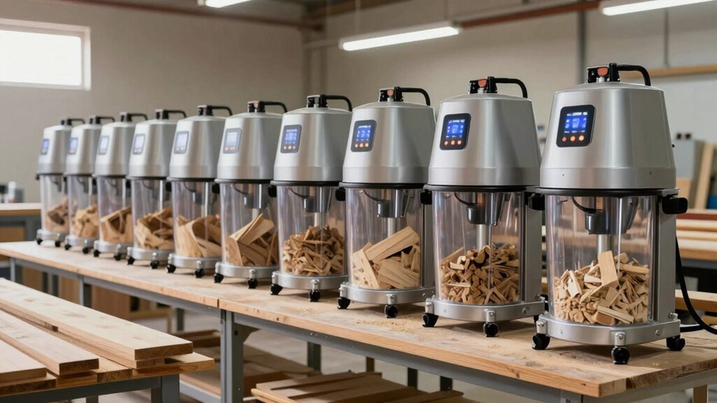 Filtration efficiency ratings are a crucial factor to contemplate when selecting a HEPA dust extractor for professional woodworking. These ratings indicate how well the system captures airborne particles, with HEPA filters removing at least 99.97% of particles ≥0.3 microns. Standards like HEPA, ULPA, and MERV differ in their filtration capabilities, but HEPA offers the highest level of particle removal for fine dust. The efficiency of these filters is validated through standardized testing, ensuring reliable performance. Higher efficiency ratings are essential for safeguarding workers from tiny dust particles that can cause respiratory issues or long-term health problems. Ultimately, choosing a dust extractor with proven filtration efficiency ensures better safety, compliance with regulations, and a cleaner, healthier workspace.