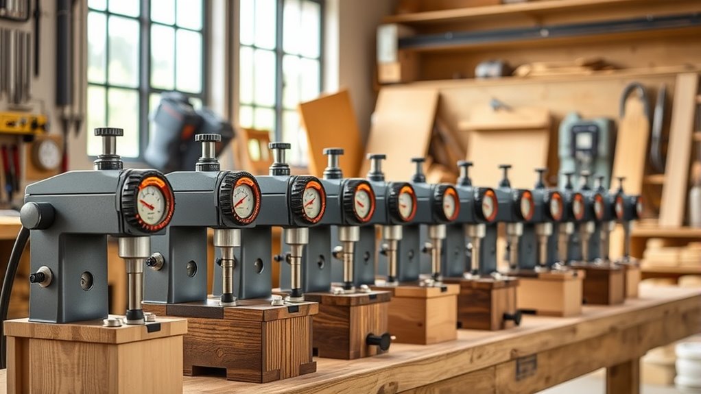 Imagine your workshop’s air thick with winter’s chill or summer’s humidity—climate definitely impacts my mortiser’s performance. Cold, dry air can cause wood to crack or shrink, making precise cuts tricky. Humidity, on the other hand, makes wood swell and can clog moving parts. I always keep my workspace stable, use moisture barriers, and regular lubrication to guarantee my mortiser stays accurate, no matter the season.