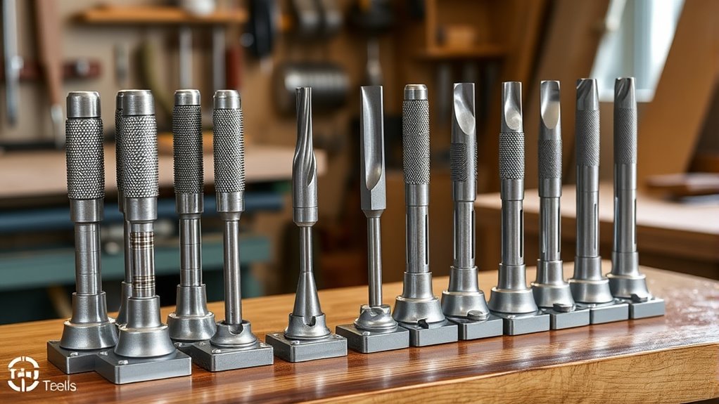 Selecting a hollow chisel mortiser that fits your existing equipment and workspace can make a significant difference in your woodworking projects. First, verify the quill diameter and mounting specifications to confirm compatibility with your drill press or mortising machine. Check the size of the mortise chisel, such as 3/8 inch or 1/2 inch, to match your project’s requirements. Confirm that your machine supports the specific square hole or mortise size you need, considering both maximum and minimum capacities. Also, examine the chisel shank type—whether round or square—to ensure it’s compatible with your current tools. Ultimately, consider the overall dimensions of the mortiser and chisel set to ensure they’ll comfortably fit within your workspace, making setup and operation smoother.