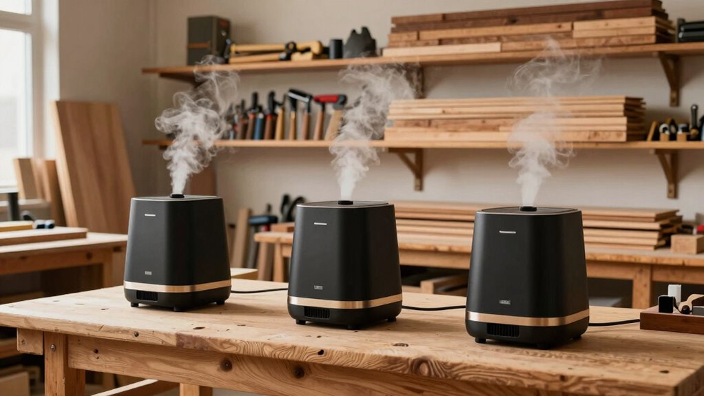 Portable humidifiers can be effective for large woodworking areas, but their coverage depends on the unit’s capacity. I’ve found that larger, high-capacity models work better, providing consistent moisture levels across bigger spaces. However, for very large shops, multiple units might be necessary to guarantee even humidity. It’s important to choose a portable humidifier designed for larger areas and monitor humidity regularly to keep your wood in ideal condition.