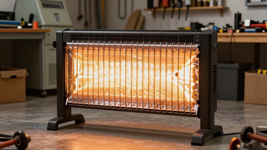 Think of these infrared heaters like a gentle whisper in a noisy room—they operate so quietly, you hardly notice them. During operation, they produce minimal noise, mostly just a faint hum or clicking sound when turned on or off. It’s almost like a cozy fireplace crackling softly in the background, making them perfect for a workshop or garage where you want warmth without disruptive noise.