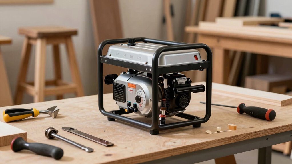 Ensuring your inverter generator operates quietly is just as important as matching its power output to your tools. Many models run between 60 and 70 decibels, similar to normal conversation or background music. However, small shop environments often require generators to stay below 65 decibels to meet local noise ordinances and avoid disturbing neighbors. Quieter models usually feature sound-dampening technology and enclosed designs that help reduce operational noise. Noise restrictions can influence your choice, as larger engines tend to produce more sound. Operating within permissible noise levels helps create a safe, comfortable workspace, especially if your shop is in a residential or shared setting. Prioritizing noise levels ensures your woodworking projects are completed without inconvenience or disturbance.