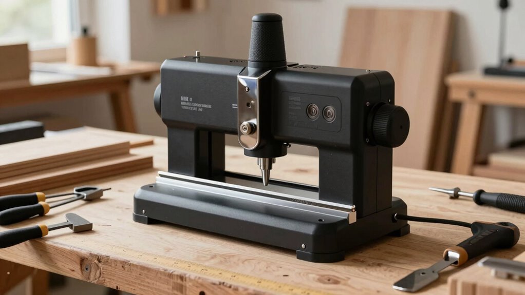 A mortising jig stands out as an essential tool for small shops aiming for precise and durable tenon joints. It guarantees perfect alignment during mortise cutting, which is crucial for stable, high-quality craftsmanship. Designed for efficiency, the jig makes mortise creation quick and straightforward, saving both time and effort. Its invisible slotting bracket enhances joint strength while maintaining a clean look, boosting aesthetic appeal. Versatile and compatible with various projects like furniture and cabinetry, it adapts to different needs. Built from high-quality materials, this jig offers long-lasting reliability with minimal maintenance, ensuring consistent, professional results every time.