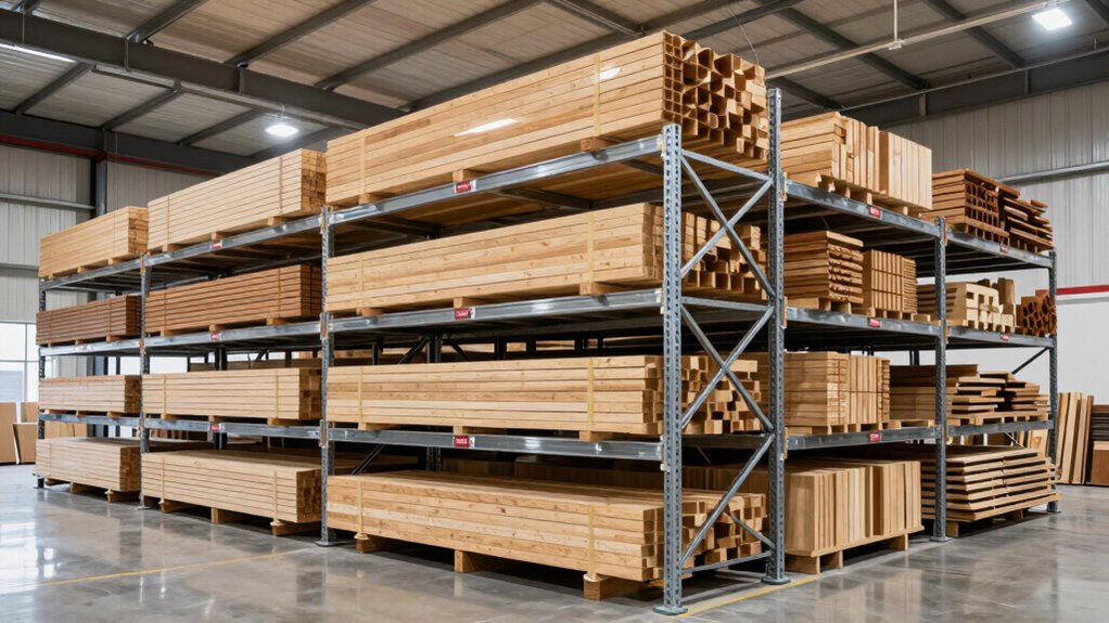 Did you know that nearly 30% of workplace accidents involve falling objects? Safety standards for lumber storage racks in Canada are strict, governed mainly by CSA Group standards like CSA S16 and S16. These regulations help to guarantee proper load capacities, secure assembly, and regular inspections. I always recommend following these standards closely to prevent accidents and protect your team, especially when storing heavy or bulky lumber.