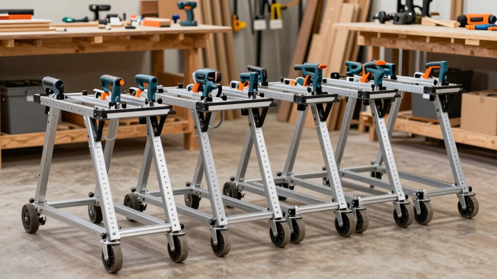 - Heavy-duty stands like Steelman Contractor and BORA Portamate support up to 500 lbs, ensuring durability for professional woodworking.