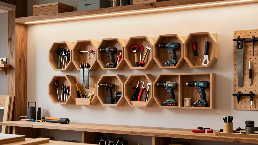 Selecting a modular tool storage wall system that can accommodate a variety of tools is vital for maintaining an organized workspace. I look for systems that support different tool sizes and shapes, including screwdrivers, chisels, clamps, and power tools, ensuring thorough organization. Compatibility with various peg sizes and hook types, like 1/4-inch round pegs and U-hooks, is essential to fit different accessories. I also verify that the system can hold tools with varying thicknesses, typically under 5/16 inch, for versatility. Additionally, I prioritize systems that can expand with extra panels and accessories, allowing my collection to grow seamlessly. Finally, I check the weight capacity of individual modules to safely support heavier tools like drills, saws, and clamps without risking damage or failure.