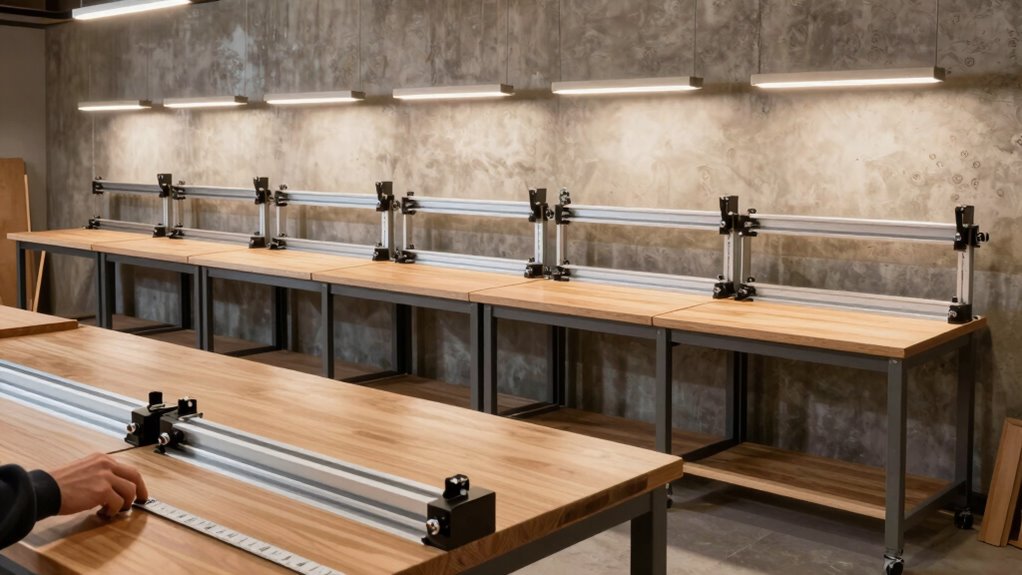 Adjustability and flexibility are essential factors that directly impact how efficiently I can work on various projects. An MFT-style workbench with adjustable height, typically from 28 to 40 inches, allows me to customize the setup for comfort and different tasks. Flexible clamping options, including multiple holes and slots, give me the ability to securely hold workpieces in various orientations and sizes. The quick and tool-free height adjustment mechanisms make it easy to switch between tasks, reducing downtime and fatigue. Modular design elements, like add-on accessories and adjustable fixtures, enable me to tailor the workstation to specific projects and workflows. Overall, these features improve ergonomics, adaptability, and productivity, making the workbench a versatile tool for professional woodworking.