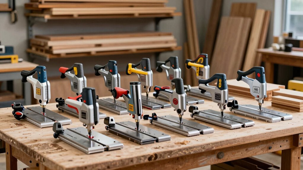 The cutting capacity of a plunge track saw is a critical factor that determines how effectively it can handle various woodworking projects. It varies among models, typically from 1.5 inches to over 2.5 inches for rip cuts. The maximum depth of cut is adjustable, allowing me to control the cut precisely based on material thickness and project needs. Bevel capabilities, often up to 45 degrees, extend the effective cutting capacity at an angle, which is useful for angled joints. The size of the blade, usually 6-1/2 or 7-1/4 inches, directly influences the maximum thickness I can cut. Additionally, some saws have extended guide rails or track systems, supporting larger sheets and longer cuts. Considering these options guarantees I select a saw that meets my specific woodworking requirements.