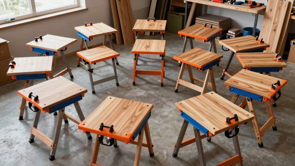 If you’re looking for the best portable clamping workbenches for woodworking in 2026, I’ve compiled a list of 15 top models. These workbenches combine durability, versatility, and portability, making them perfect for DIY projects or professional jobs on the go. From heavy-duty folding tables to versatile vise solutions, there’s something for every need. Stick with me, and you’ll discover detailed features, benefits, and tips to choose the right one for your workspace.