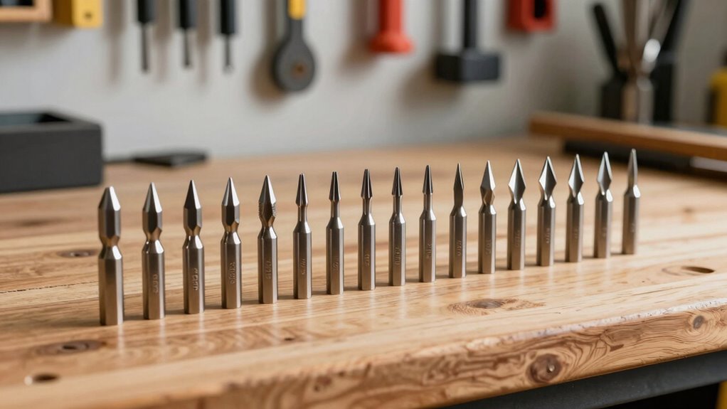 Choosing the right bit material is like selecting the perfect brush for a masterpiece. I consider the project’s demands—harder woods need carbide, while softer materials might do with high-speed steel. I also think about precision and durability. For detailed work, I lean toward tougher, sharper bits. By matching the material to the task, I can guarantee cleaner cuts and longer-lasting tools, making my projects smoother and more professional.