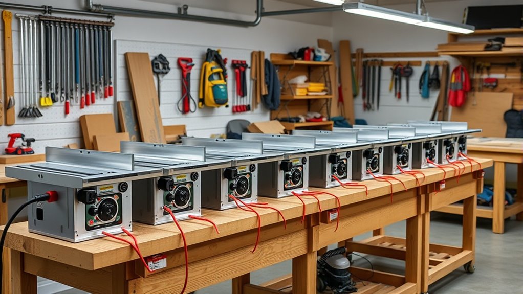 Evaluating space and storage needs is essential to fitting a spiral cutterhead benchtop jointer comfortably into your garage workshop. First, measure your available workspace carefully to ensure the jointer’s size fits without overcrowding. Look for models with extendable tables or arms; these maximize cutting capacity while keeping the machine compact when stored. Consider the jointer’s footprint, including fence and support extensions, so you can optimize storage when it’s not in use. If space is limited or you need to move the machine frequently, choose a lightweight or portable model for easy handling. Additionally, incorporate dedicated storage solutions like wall mounts or vertical racks to keep the jointer and accessories organized, freeing up valuable workspace and keeping your garage tidy.