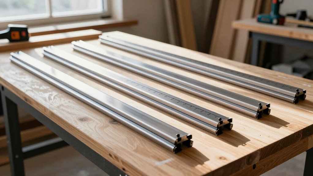 Portability and storage are essential factors to contemplate when choosing a guide rail system, especially for those working across various job sites or limited workspace environments. Lightweight, extruded aluminum rails make transportation easy, allowing me to carry and handle them without hassle. Compact options like foldable or modular systems save space and improve mobility, which is crucial when working in tight areas. Carrying cases or rail holders protect the guides from damage and make storage more convenient, extending their lifespan. Adjustable or extendable rails also add versatility, letting me customize lengths for different projects without sacrificing portability. Proper storage solutions prevent warping, bending, or scratches, ensuring the guides stay accurate and durable over time. These features make a guide rail system both practical and reliable on the go.