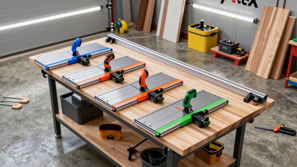 Ever wonder how the length of a guide rail impacts your cutting capabilities? The answer is straightforward: longer rails let you cut larger sheets in one pass, reducing the need for multiple cuts. Typically, guide rails range from 55 inches to over 110 inches, so choosing the right size depends on your project needs. If you mostly work with plywood or large panels, a longer rail offers greater versatility and stability, ensuring cleaner, more accurate cuts. Just keep in mind that longer rails can be heavier and harder to maneuver or store in a busy garage. Make sure the rail size is compatible with your saw’s track system and can be securely connected for extended cuts. Balancing length, stability, and portability is key to selecting the best track for your workshop.