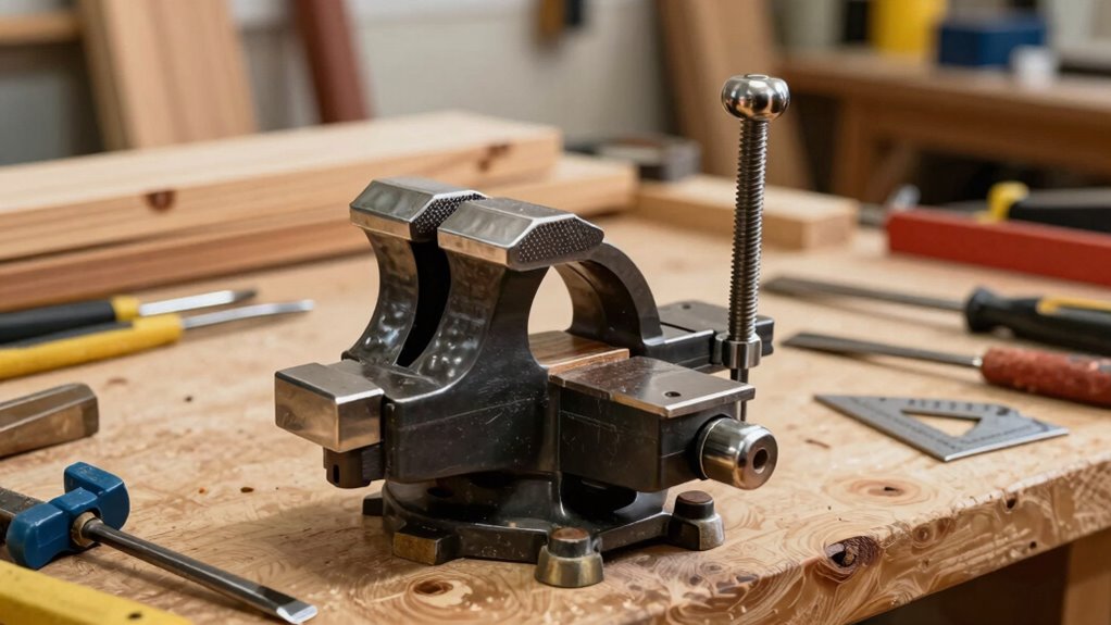 Did you know that over 30% of woodworking accidents involve improper tool use? When choosing a vise, safety features are vital. Look for quick-release mechanisms to avoid pinched fingers, sturdy locking systems to keep your work steady, and smooth, rounded edges to prevent cuts. Make sure the vise is securely mounted and made from durable materials. Prioritizing these safety features helps protect you while you craft your projects.