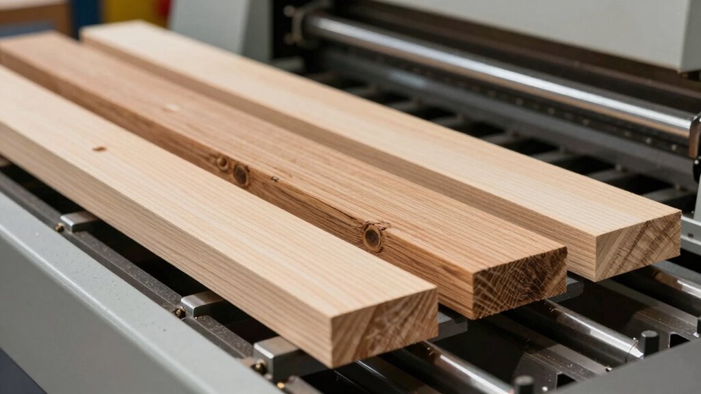 You should choose hardwoods like cherry, maple, or oak for flat milling, as they have stable grain selection and minimal warping. Make certain the lumber has consistent moisture content—around 6-8%—to prevent movement during drying. These types of lumber respond well to milling, staying flat and true. Always check grain direction and moisture levels before milling to ensure the best results for your project.