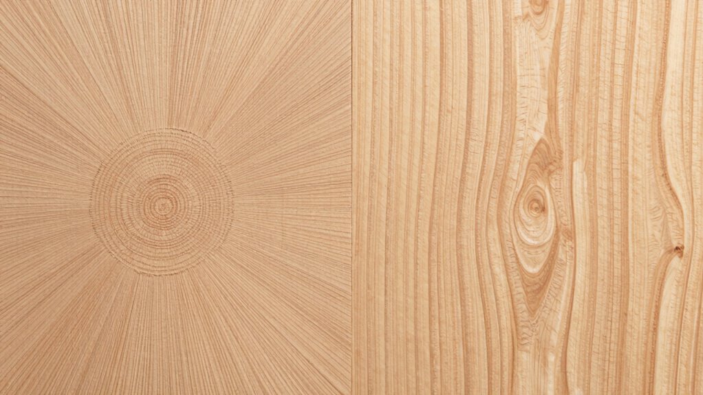 Have you ever wondered how to tell quarter-sawn and flat-sawn wood apart just by looking at their grain patterns? The key lies in grain orientation and visual texture. Quarter-sawn wood displays a consistent, straight grain pattern with rays that run parallel to the surface, creating a subtle, linear look. Its grain lines are usually narrow and uniform. In contrast, flat-sawn wood shows a more varied grain pattern with wider, wavier lines and prominent swirling or cathedral shapes. The visual texture of flat-sawn wood is often more dynamic and less uniform. By examining these patterns, you can easily identify the grain orientation and distinguish between the two cuts, helping you make better-informed decisions for your woodworking projects. Recognizing these differences can also influence the durability and stability of the finished piece.