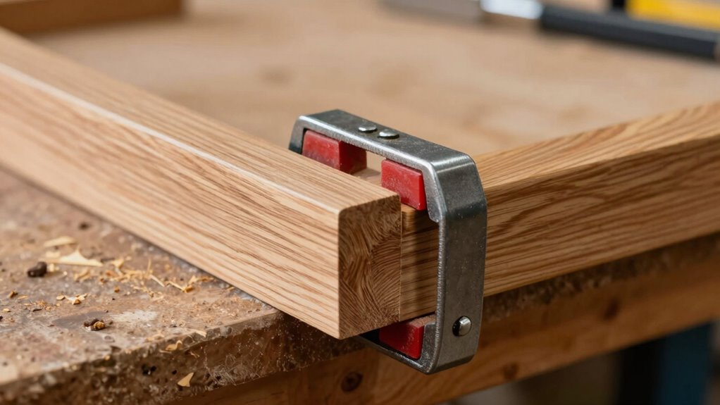 To securely hold miter joints in place as the glue sets, corner blocks and cauls are invaluable tools. Corner blocks are small, precisely cut pieces that fit snugly into the inside corners, preventing movement and maintaining perfect 90° angles. Caul clamping involves placing a flat, sturdy caul across the joint, distributing pressure evenly and preventing any misalignment. You can position the corner blocks inside the joint before applying glue, then use the caul to clamp the assembly tightly. This method guarantees consistent pressure and prevents the joint from shifting. Proper ventilation considerations during glue drying can also help ensure a strong, durable bond. With corner blocks and caul clamping, you keep your miters perfectly aligned and secure during the drying process, resulting in tight, accurate corners that require minimal cleanup or adjustments later.