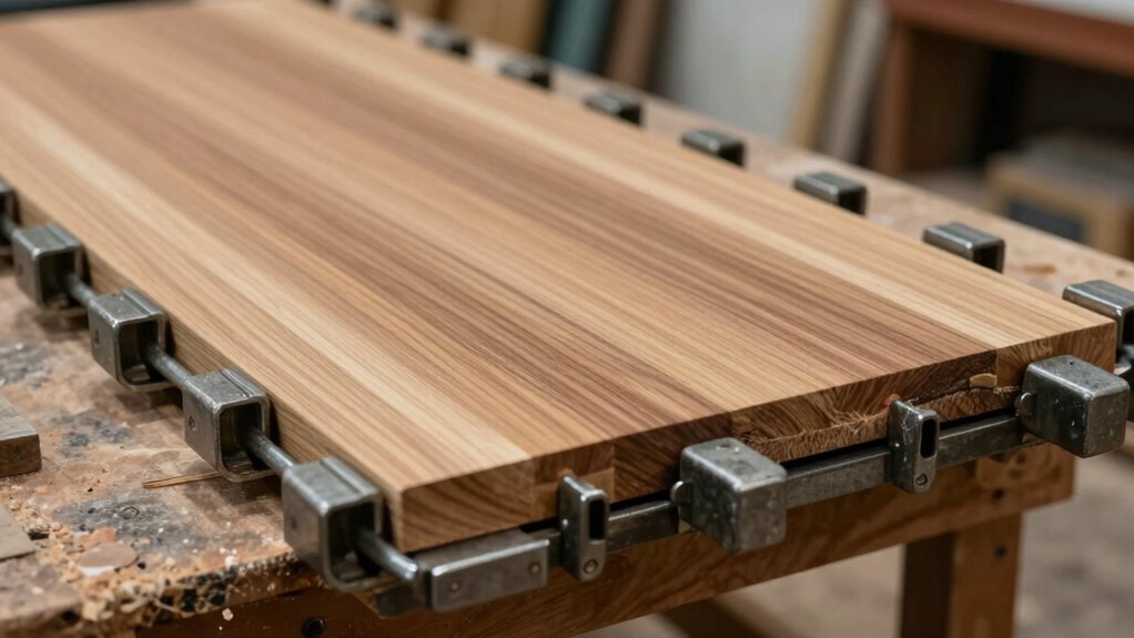 To get the best results, you need to guarantee the pressure from your clamps is spread evenly across the panel. Using clamping cauls can help distribute force and prevent uneven bending. Keep these tips in mind to achieve a flat, professional finish every time. Proper clamping techniques involve careful planning of pressure points and understanding wood movement to maintain panel flatness.
