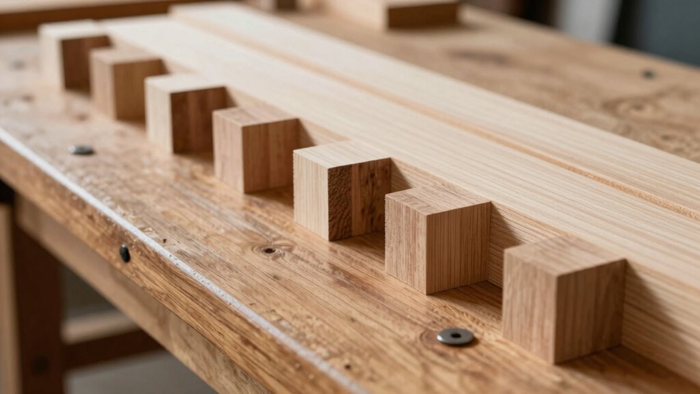 Choosing the right material for your custom stop blocks can be a game-changer. Opt for dense hardwoods like maple or oak—they offer superior durability and hold up well under repeated use. Avoid softwoods that may wear or compress over time, risking inaccurate cuts. The right wood selection guarantees your stop blocks stay true, providing reliable, repeatable cuts, and keeping your workspace safe and efficient. Don’t settle for less when precision matters most.